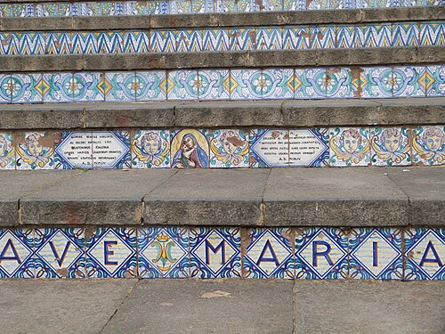 In the morning, drive along the scenic coastal road to Gela and inland to Caltagirone, Sicily's historic center of ceramic production. Walk from the city's highest point (weather permitting, with a view of the snow-capped Mount Etna) to the ceramic-decorated "Thousand Steps" (photo: details of 103rd step). Continue into the Ereic Mountains and to the picturesque hilltop town of Piazza Armerina, where we will have lunch.