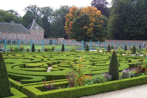 We were very fortunate, as the sun broke through the ominous clouds and warmed our visit to Het Loo’s Baroque Dutch gardens– designed by Claude Desgotz, who adhered to the general formula for Baroque gardens established by his uncle André Le Nôtre in his gardens for Versailles: symmetry, axial layout with radiating gravel walks, parterres with fountains, basins and statues.