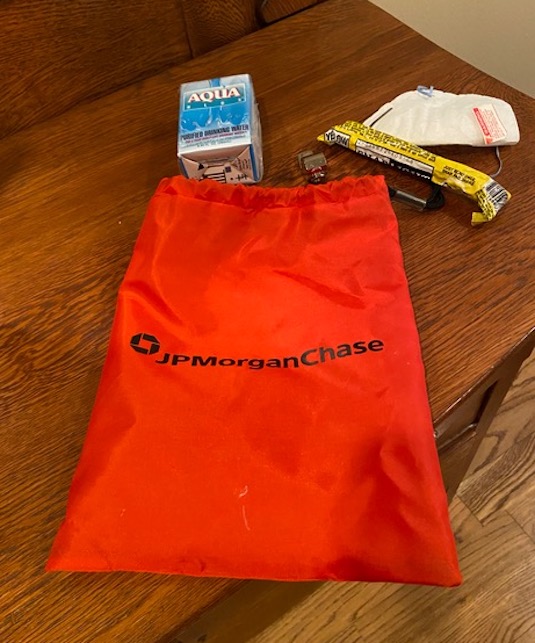 # Object of the Week: Gail Cieszkiewicz was a JPM Chase Texas employee working in NYC on weekdays. She recently found her survival kit, although she isn't sure if it was issued by HQ in New York or given to her by a Chase Texas worried about her in the Big City (not that Houston is small). The survival kit had a box of water, expiring January 7, 1995, a whistle, a mask and a snap-light lightstick. "I still remember the drills after 911, walking down lots of stairs in heels. My legs felt like rubber," she said.