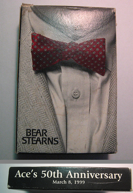 # Object of the Week: Bear Stearns issued these commemorative playing cards to mark Alan "Ace" Greenberg's 50th anniversary with the firm. Greenberg, who began as a clerk in the firm's stock room in 1949, died in 2014 at the age of 86. He was chairman of Bear Stearns when it was acquired by JPMorgan Chase, following Bear Stearns's collapse in 2008. According to The New York Times, JPMorgan had him stay on as vice chairman emeritus and let him take 40 percent of trading commissions he generated. In early 2010, JPMorgan discontinued the Bear Stearns name in early 2010. Greenberg, a champion bridge player, always kept a deck of cards on his desk.