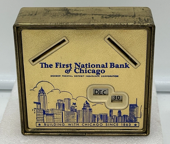 # Object of the Week: Showing the Chicago skyline of the 1950s, here's a metal vintage coin bank of the era for The First National Bank of Chicago. Over the years, the bank operated under several names, including The First National Bank of Chicago and First Chicago NBD (following its 1995 merger with the former National Bank of Detroit). In 1998, First Chicago NBD merged with Banc One Corporation to form Bank One Corporation, which was acquired by Chase in 2004. (Wikipedia)