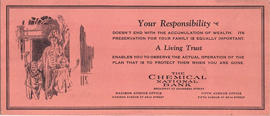 # Object of the Week: 1930s Blotter promoting Living Trusts from The Chemical National Bank: "Your Responsibility doesn't end with the accumulation of wealth. Its preservation for your family is equally important. A Living Trust enables you to observe the actual operation of the plan that is to protect them when you are gone." The three NYC offices promoted were on Broadway at Chambers Street, Madison Avenue at 46th, and Fifth at 29th.