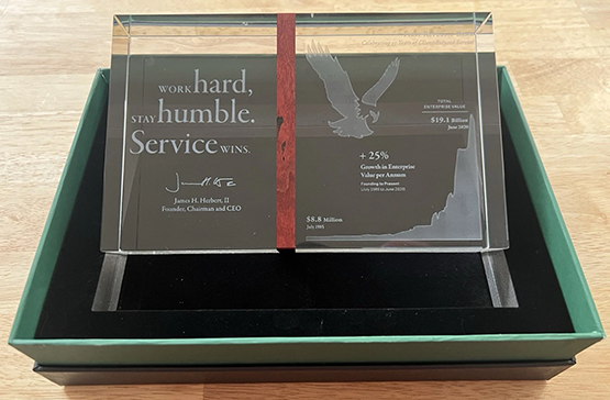 # Object of the Week: 35th anniversary crystal plaque issued by First Republic Bank, celebrating 25 percent growth in enterprise value per annum from its founding in July 1985 ($8.8 million) to June 2020 ($19.1 billion). Following a major liquidity crisis less than three years later, regulators closed the bank on May 1, 2023, marking the second-largest bank failure in U.S. history. JPMorganChase acquired substantially all assets and deposits, converting branches into JPMorgan Chase locations. (Stay humble, indeed.)